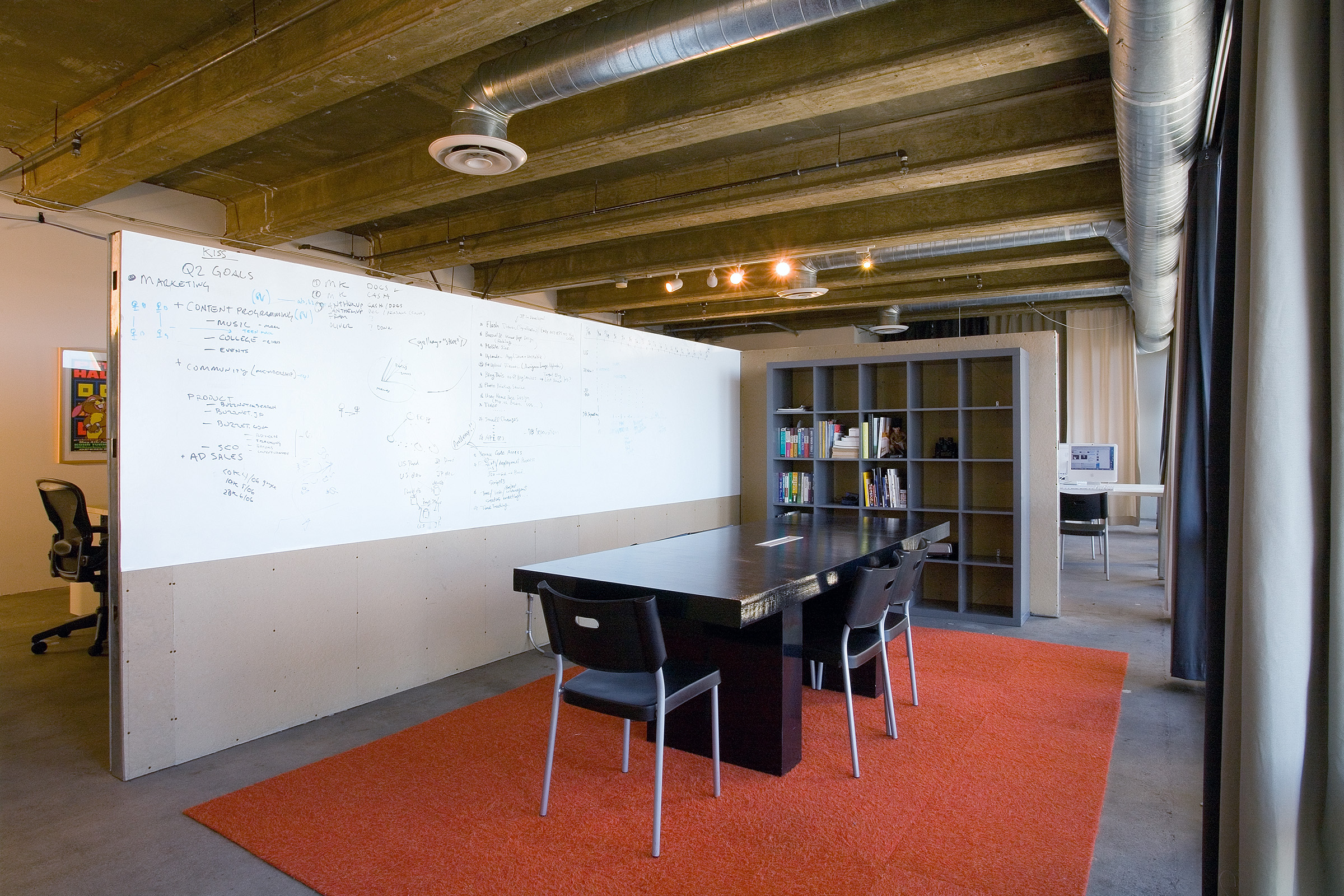 This interior fit-out created an entry area, open and closed bullpens, conference room and executive suite, plus supply room and kitchen. Partitions are exposed metal studs faced in sanded homosote and flush-edge whiteboards. Carpet tiles and stitching on the curtains use the company's logo colors (orange and sky blue). Furniture was custom built on a shoestring budget.