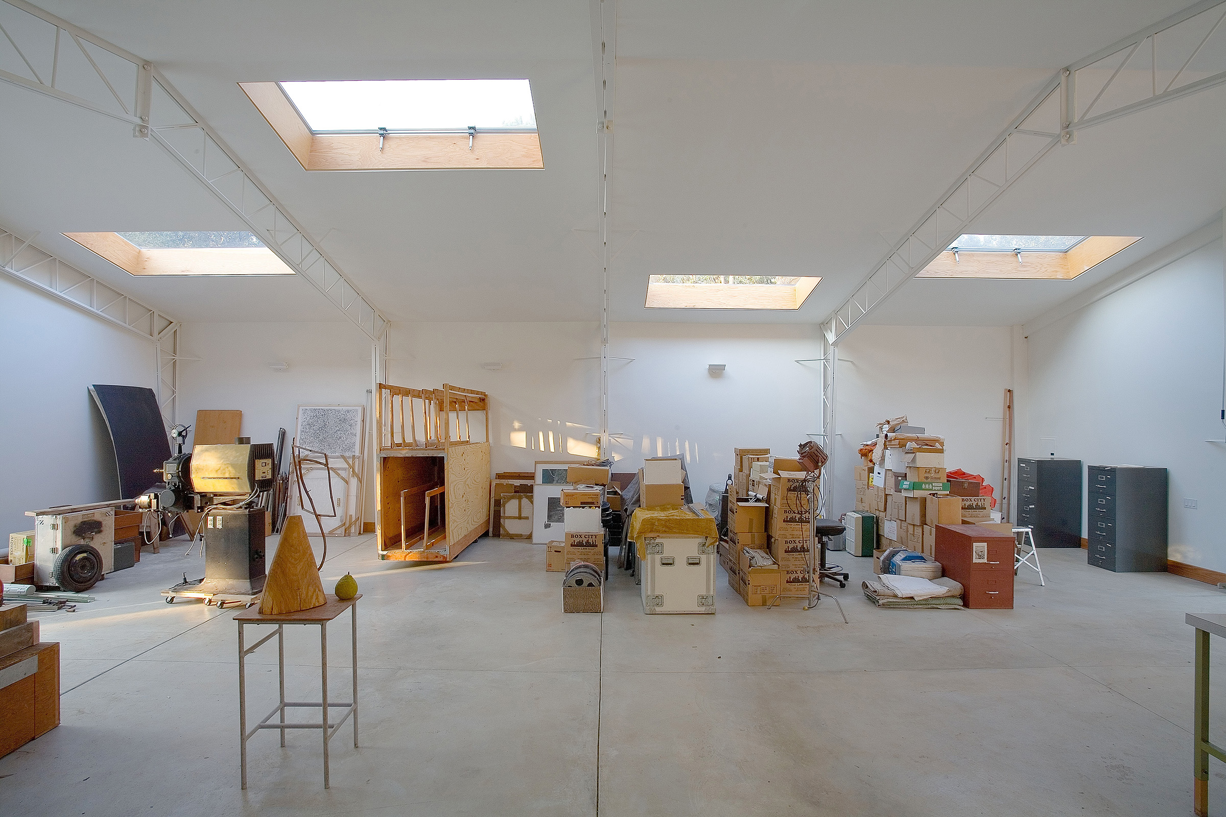 Pat O'Neill is a world-renowned independent filmmaker and installation artist who has been a vital force in West Coast independent filmmaking since the 1960s. Having relocated to a craftsman home in Pasadena after many years in Laurel Canyon, he needed a new studio building. This structure provided 1800 square feet of uninterrupted interior space, plus an additional 600 square feet of exterior work area under a large trellised porch. Pre-engineered and prefabricated steel trusses allowed clear spans and a simple, wide-open appearance on the inside. The exterior is clad in unpainted vertical redwood siding. Oversized doors allow for moving large equipment and materials. North-facing skylights were placed asymmetrically to vary the framed views and modulate the diffusion of indirect sunlight across the space.
